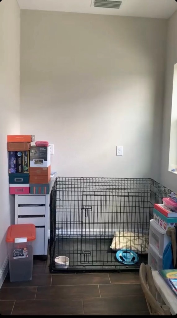 The builder offered an option to have a granite counter built along the width and length of the room and one cabinet at the end . . . and while we loved the idea, we did not like the price tag, so during our design meeting, we opted to leave the room empty, deciding we would eventually hire someone to build our vision. Fast forward to moving in . . . we thought we would get to it once things settled down . . fast forward again . . . life never gave us a break, and between careers and children, our pocket office dream slowly turned into a catch all disaster . . . the lovely space off the breakfast room became a storage space for everything we did not know what to do with . . . oh, and the dog crate. Fast forward one more time . . . . to March 2020 . . . Covid lockdowns started in our state.