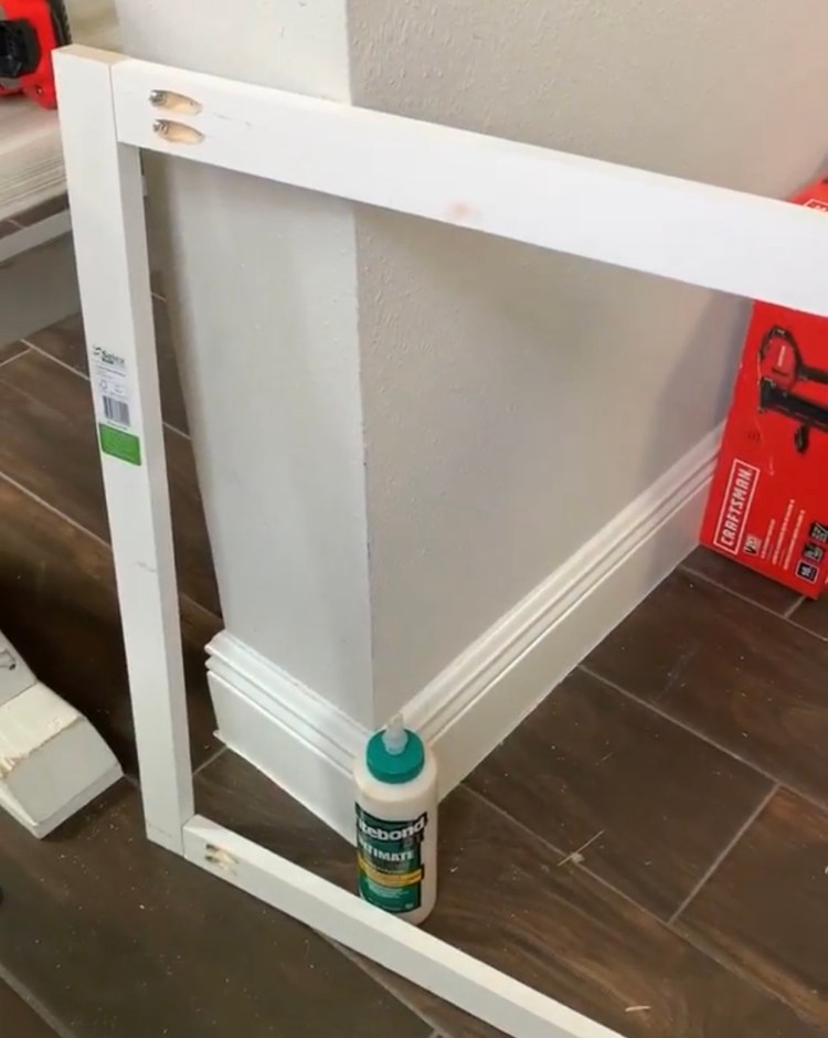I cut all my 2×4 to size on the mitre saw. I cut 2 pieces the width of the room, and 5 pieces the depth of the base (this can change dependent on the overall width of your cabinet space, the more you have, the more support). I then drilled pocket holes in each of the shorter pieces using the kreg jig, applied wood glue to ends and attached them to the longer 2×4’s using my 2 1/2″ pocket hole screws. If you are unfamiliar with how to work with pocket holes, I plan on making a short post with instructions at a later date, or you can simply search YouTube and I promise there are a ton of how-to videos out there right now. Always check your corners for accuracy using a 90 degree angle . . . crooked corners are hard to recover from at any point during a project.