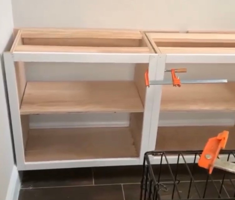 Once the cabinets are built, you will want to set them on the 2×4 base and secure them to both the base AND to studs in the wall. Do not skip this step, otherwise you’ll find your cabinets come toppling down on you at some point. I used 3″ wood screws for this.