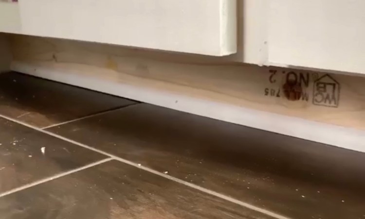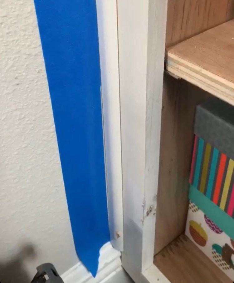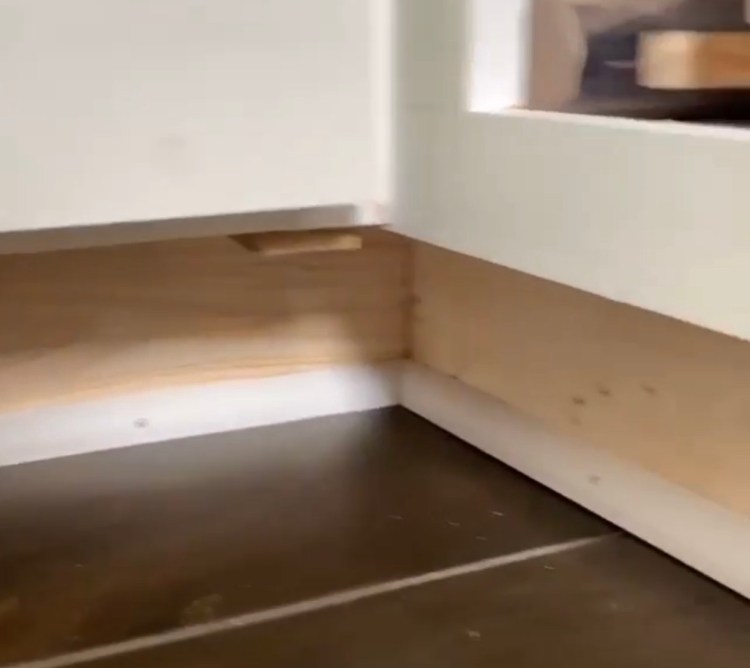 The final few steps I want to share for the cabinet build are the trim details. This post has already run quite long, so I have decided that I will make a completely separate post for the doors. To complete the frames of the cabinets, I also needed to install shoe moulding along the bottom and trim along the sides to fill the gap between the cabinet and the wall. The type of shoe moulding you select is entirely up to you, there are a lot of options at your local supply stores, I went with something pretty basic. I used my mitre to cut each length to size, and also to cut my mitered corners where each piece would line up at a 45 degree angle. I intend to share yet another post on cutting angles with a mitre. For now, I can share a few screenshots below from videos I took. Each piece of moulding was attached with wood glue and 2″ brad nails. And to clean up the look, I caulked along all of the seams and used wood filler in all the nail holes (sand after drying).