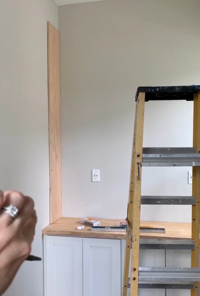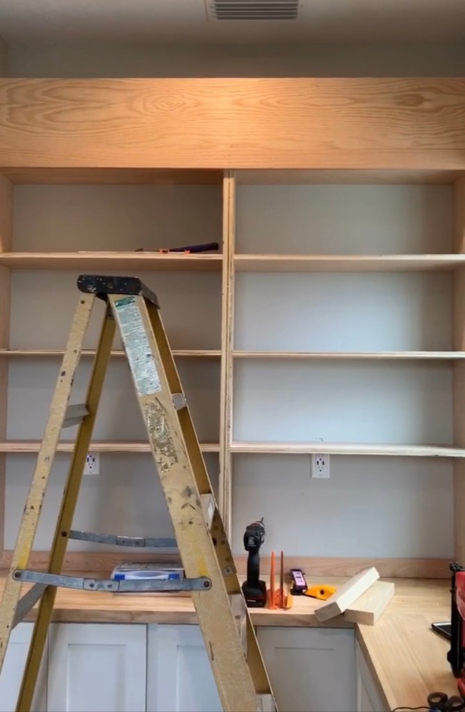 Each of my 4×8 3/4 plywood sheets had a 8×72” scrap strip, so I cut one down to the width of the entire unit and attached it with brad nails and wood glue. I also had a spare 1×3 laying around, so I cut that to size and attached it right below the 8” piece, this 10 1/2 inches covered the distance from the highest shelf to the very top of the unit. I filled the seam between the two pieces and all the nail holes with wood filler and let it dry a few hours before sanding. I also realized that since I would be adding sconces, I would need to beef up the support behind this last minute addition, so I took some scrap 2x4s I had in the garage, cut them down to 8 inches, drilled some pocket holes and then screwed them in to the top shelf behind the panels I just installed. I did this in the exact middle of both units. I wish I could share photos, but I did not take any, but these 2×4 additions would be necessary support for the lights to be drilled into later.