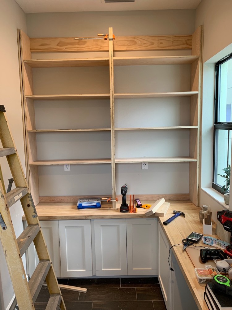 Once the top and bottom support beams were screwed in for both units, I applied wood glue to the entire outside of each panel, and placed them on top of the counter. I used clamps to hold them together in the middle as the glue dried. I then used my brad nailer with 2” brad nails to secure the sides to the plywood I had already screwed into the wall. Finally, I located my studs on the back wall and used 3” cabinet screws to secure the support beams (top and bottom) to the back wall. This can be seen in the image above. Once I double checked all my corners with a speed square, and the tops with a level, it was time to move on to the shelves.