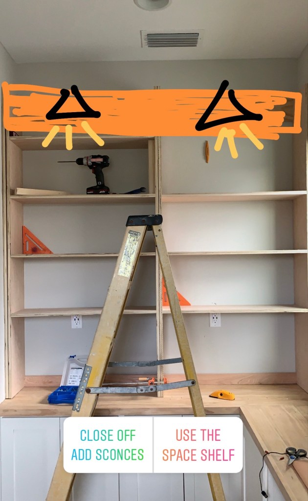 Making and installing the shelves was a pretty fast process, but once they were done, I found myself in a design dilemma . . . At this point I had already changed the height of the shelves from the original design, so my final shelf fell a little higher than I had planned. If you can see in the photos, my bottom shelf is rather tall, it was a last minute decision to build the first shelf ABOVE the outlets and create a bigger cubby so that I could add some storage baskets. This room would be for e-learning, and I thought the addition of storage baskets with access to the outlets would allow the kids to charge their laptops and headsets overnight in an organized fashion rather than just leaving them on the desktop. With this change, it stole some space from what should have been a 5th shelf at the top. After some debate, I realized I could close off the very top shelf and install some faux sconces (well they are real sconces, but I would not wire them, instead I would use battery operated puck lights), and this would really add some glamour to the office. Good thing I still had some scrap plywood!