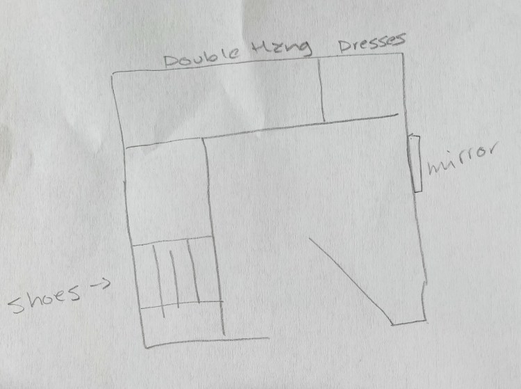 When I looked in her closet beyond the disaster, I saw so much potential. With previous builds, I have learned how a built in can actually make a small space feel so much bigger, so I immediately started drafting a few different configurations. The closet itself is roughly 5×5 (give or take) . . . . and the first draft I came up with an L-configuration, and even though I hate a “blind corner”, I thought we could use it to store her less used items so that not being in her immediate reach would not be an issue. But as I started to build, I shifted (no surprise there) and modified my original plans. I’ll share my rough overhead sketches below as well as the builder floorplan so you have an idea of the closet space. I wish I could say I was proficient in Sketch Up with my designs, but I’m not quite there yet, so please enjoy my archaic pencil and paper drawings.