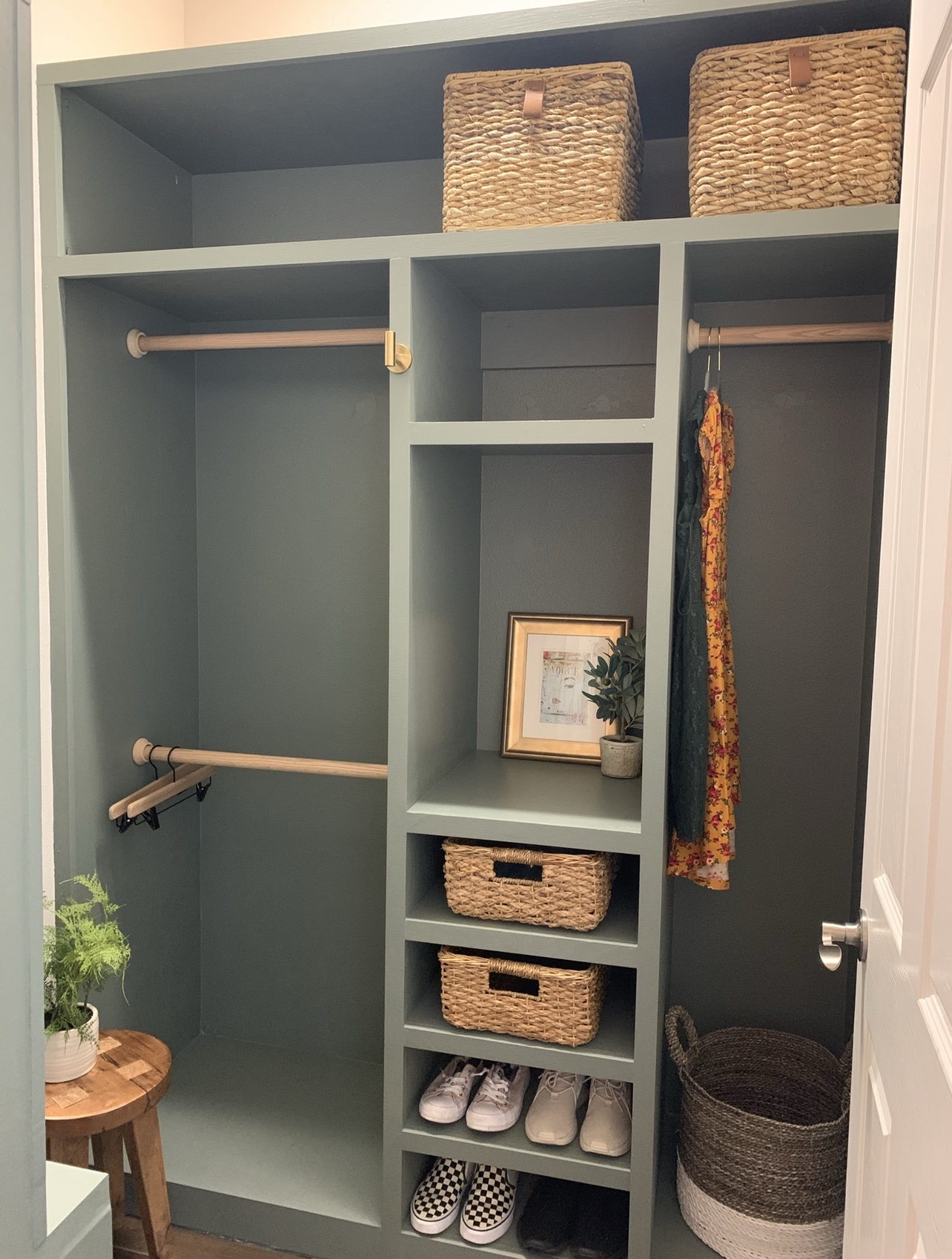 With this new shift design, I decided to move the shoe shelves from the left wall to the center cubby along this wall. I decided on the height of each cubby based on her shoes and went from there. I also took her feedback and made one large shelf in the middle where she said she wanted to store accessories, etc. I cut each shelf the width and depth of the cubby from my 3/4″ plywood, drilled pocket holes and installed them with 1 1/4″ pocket hole screws as well as wood glue. I did 4 pocket holes on each side, 2 towards the back and 2 towards the front on the bottom half of the shelf. I used two precut pieces of scrap wood to help me ensure the accuracy with the spacing of each shelf so that I didn’t have to keep measuring as I installed them. For the lower shelves, I secured the pocket holes from the bottom, and for the higher shelf above eye level, I secured it from the top. And as before, caulk the seams and wood fill the holes.