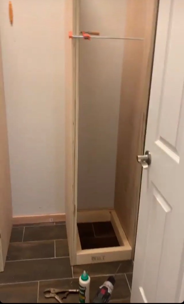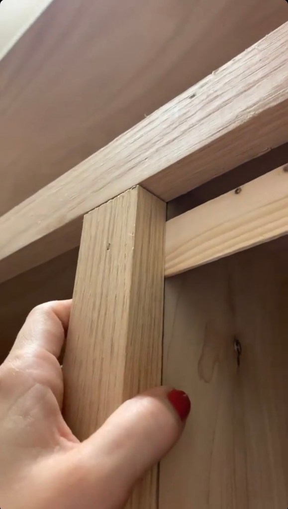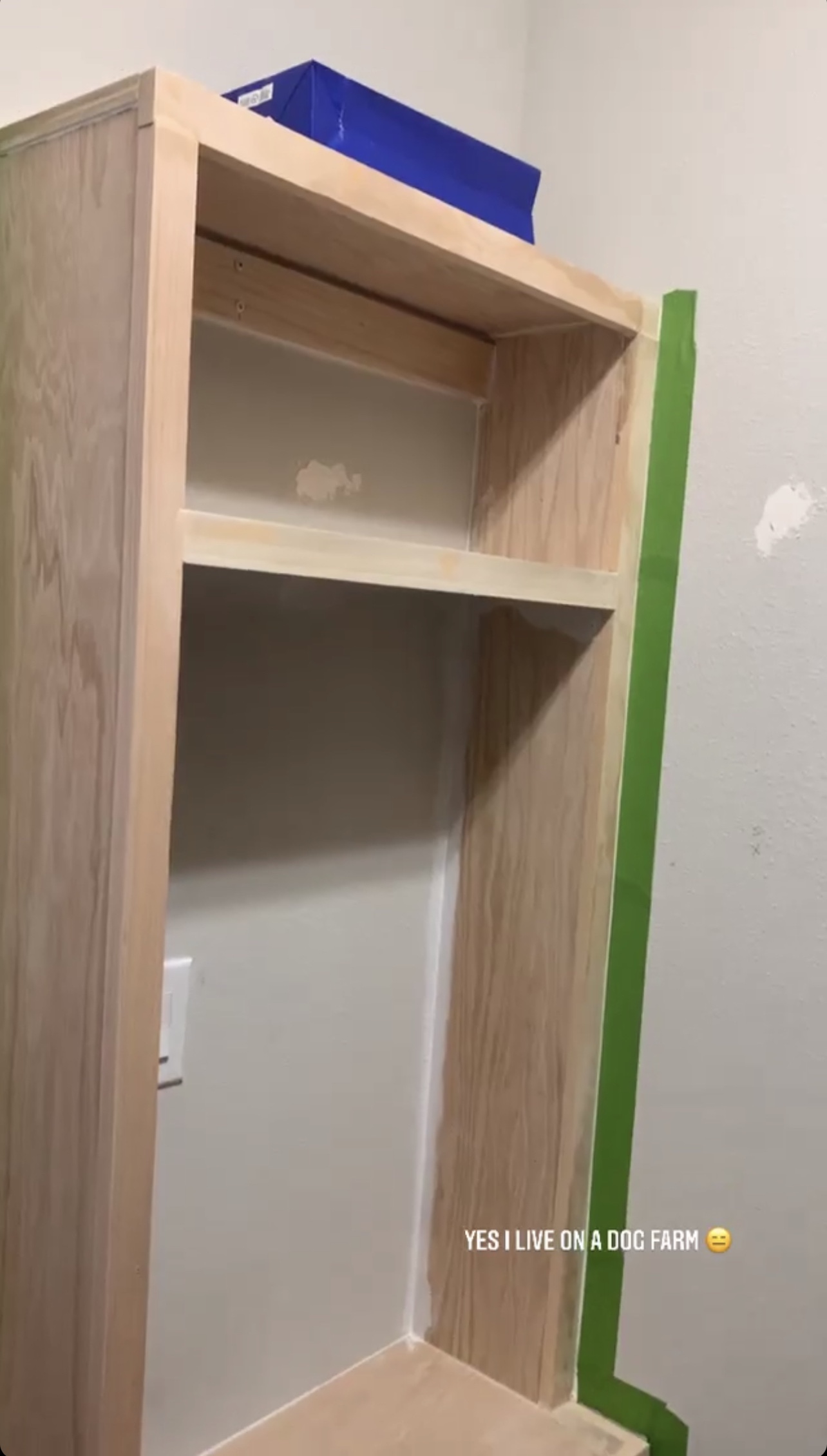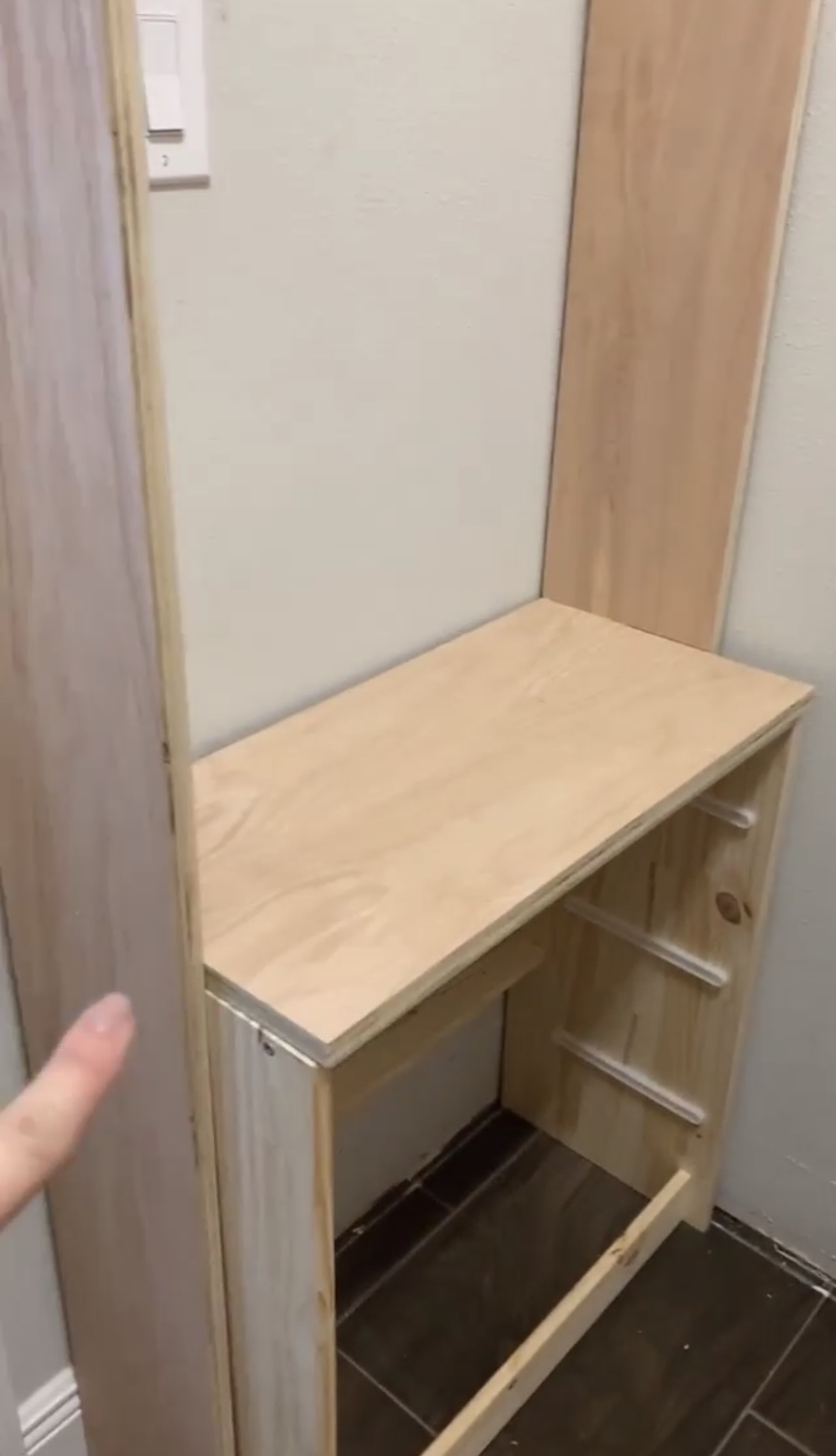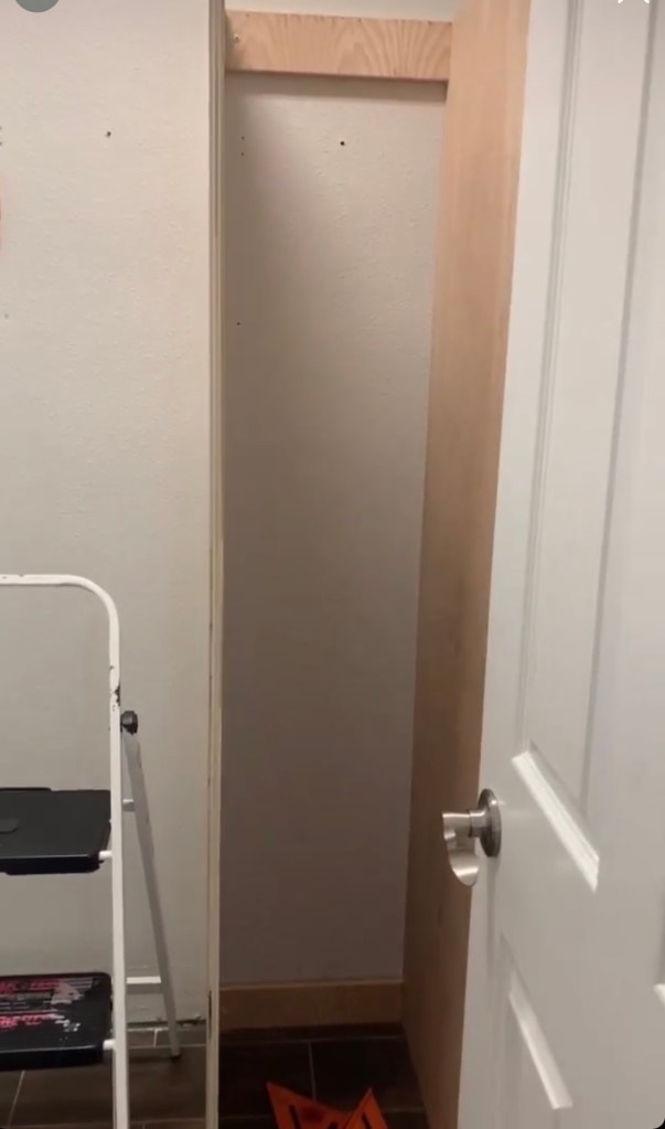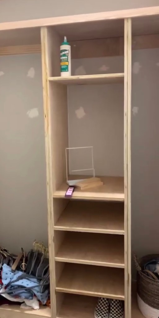 Once these shelves were installed, I started working on the top cubby that would span the width of this entire unit. The first part of this was cutting a piece of 3/4″ plywood the width of the entire closet and then the depth of the unit. I secured this to the unit with wood glue, wood screws and brad nails after ensuring it was level. I then built the cubby that would sit on top of this. I cut the 3/4″ plywood to the same size. Then I cut 2 pieces of 3/4″ plywood to the height I wanted this cubby. I secured them to the bottom shelf and the top shelf using pocket holes and 1 1/4″ pocket hole screws as well as wood glue. I created a support beam across the back to secure it to the studs of the back wall. Check that it is level, caulk seams and wood fill. I wish I had a better photo to share but I literally only have this screenshot of a video I took.