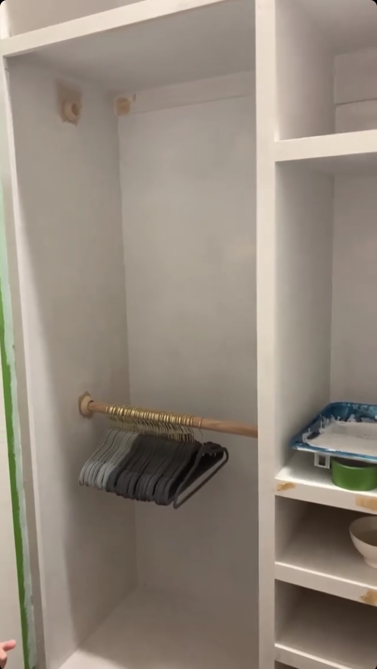 As you can see in the pictures above, I got ahead of myself and installed the hanging rods the double hand cubby and the long hang cubby (I recommend waiting until after you paint to do this but I’m an impatient person and wanted to see it). I wanted to keep these a natural wood color that would compliment the color I would be painting the unit , so I purchased some oak dowels at Home Depot and found some complimenting pole sockets to match.