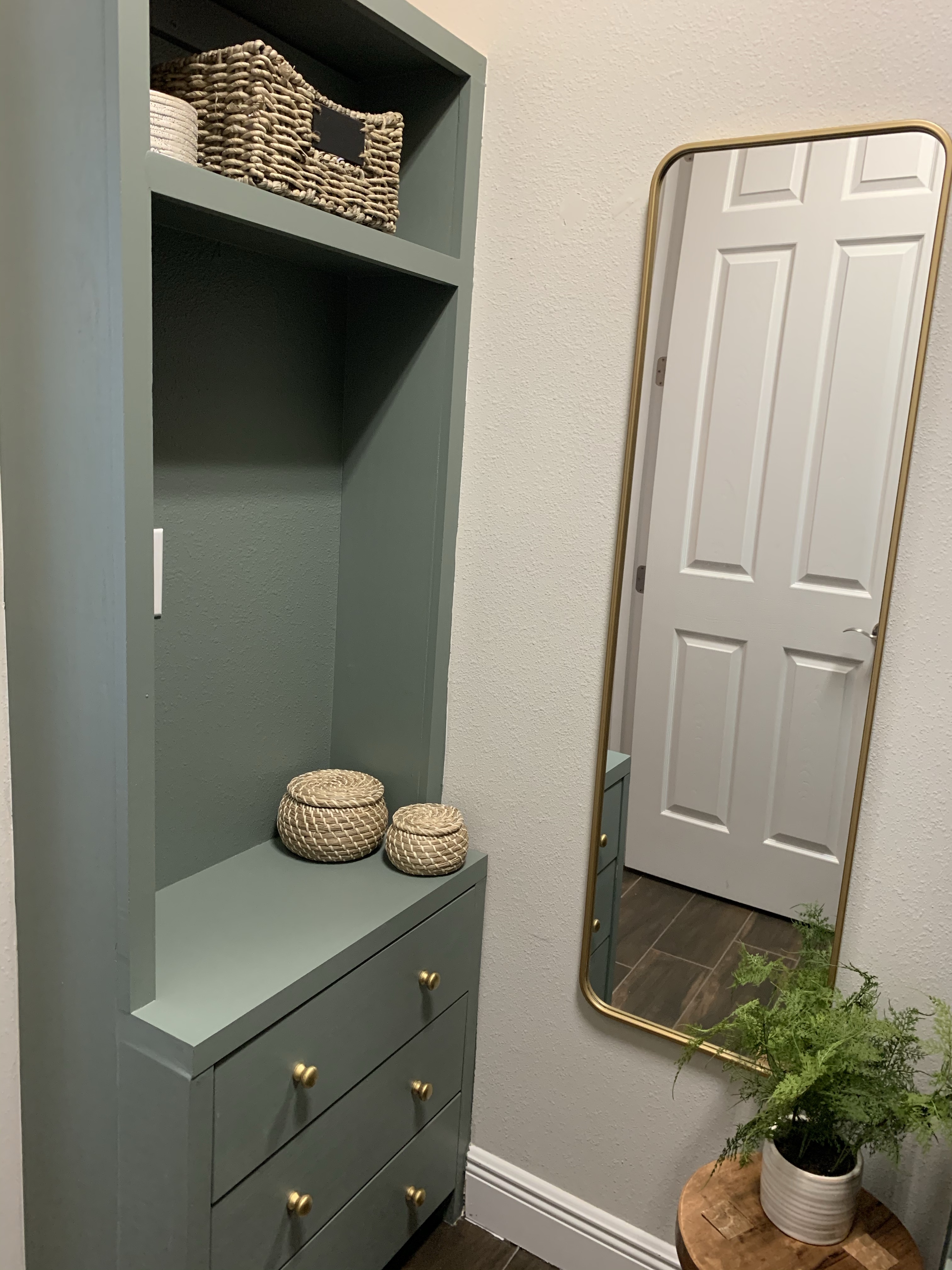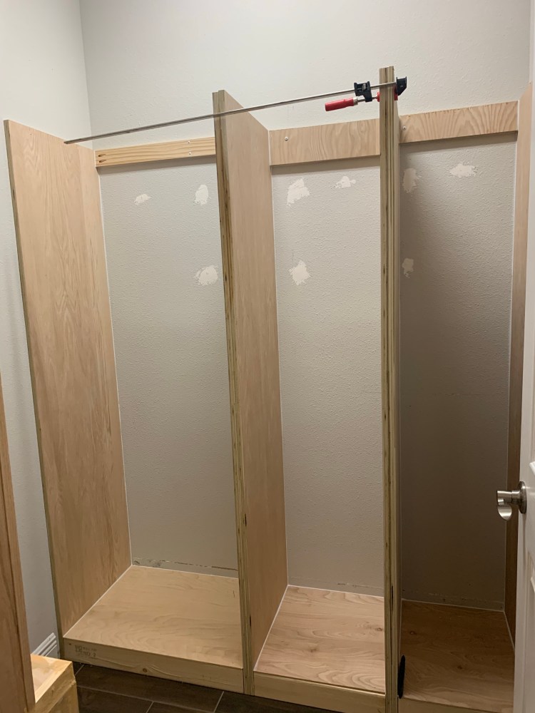 I did a lot of research to determine the depth that I wanted for these units, and found that it really ranged depending on several factors including (but not limited to) space available, desired look, and clothing type that would be stored. Ultimately I needed to consider the size of the space I was working in and went with what would give me the space I needed in order to build a unit across from it and allow some dressing space in between the two. From there I cut 6 strips of my plywood in the depth and height of the unit (2 for each cubby / unit). I built each cubby attaching the 2 pieces of plywood with strips of scrap wood across the top and bottom (think 1x3s or 1x4s) using pocket holes and pocket hole screws across the back. Then I built the bases using 2x4s and wood screws. See the images below for a better idea. These units are secured to the studs in the wall using cabinet screws through the back braces across the top and bottom, wood glue between each cubby and I shot a few brad nails to the connecting cubbies just because. (side note to say, check to make sure everything is LEVEL before securing).