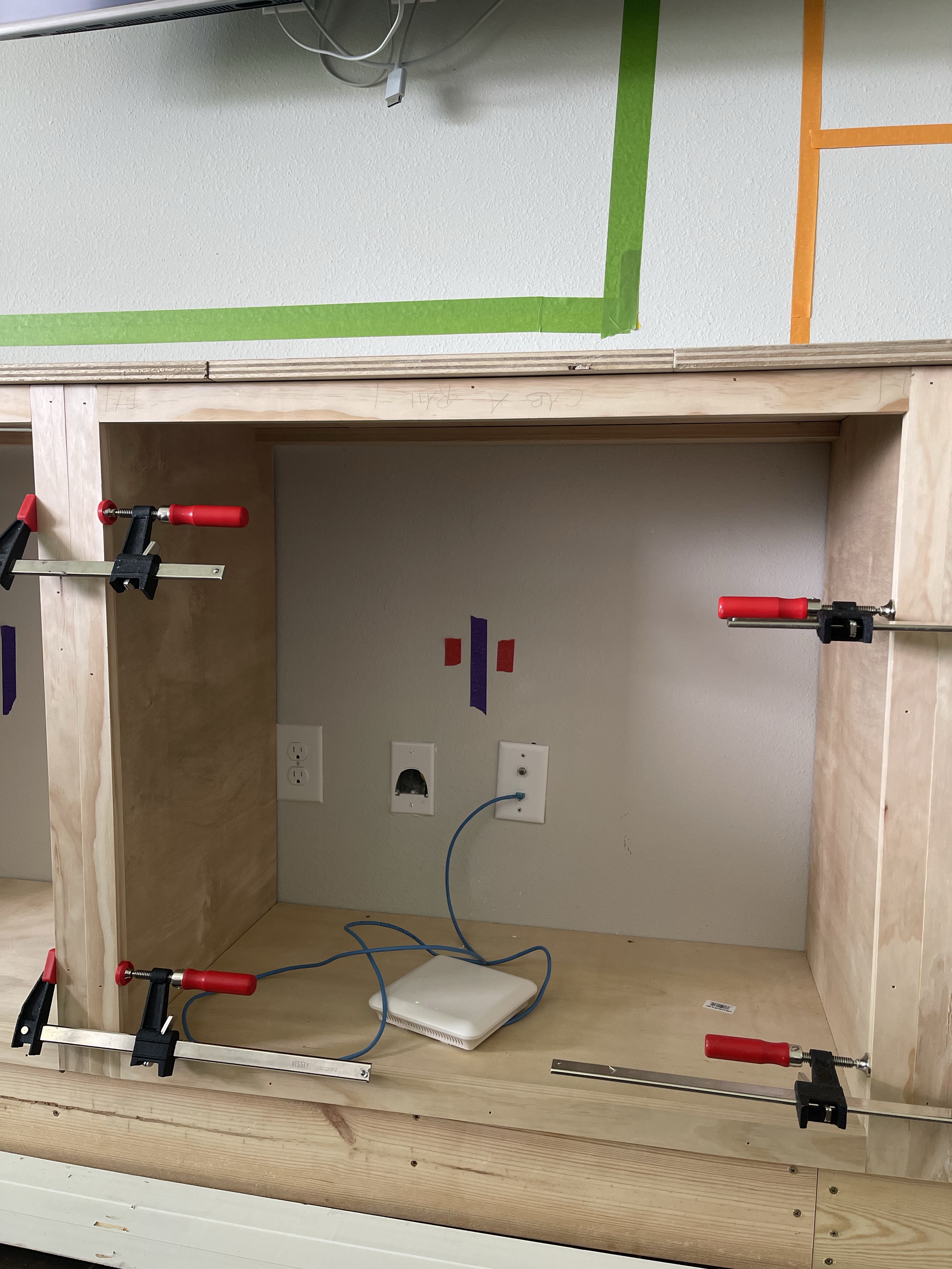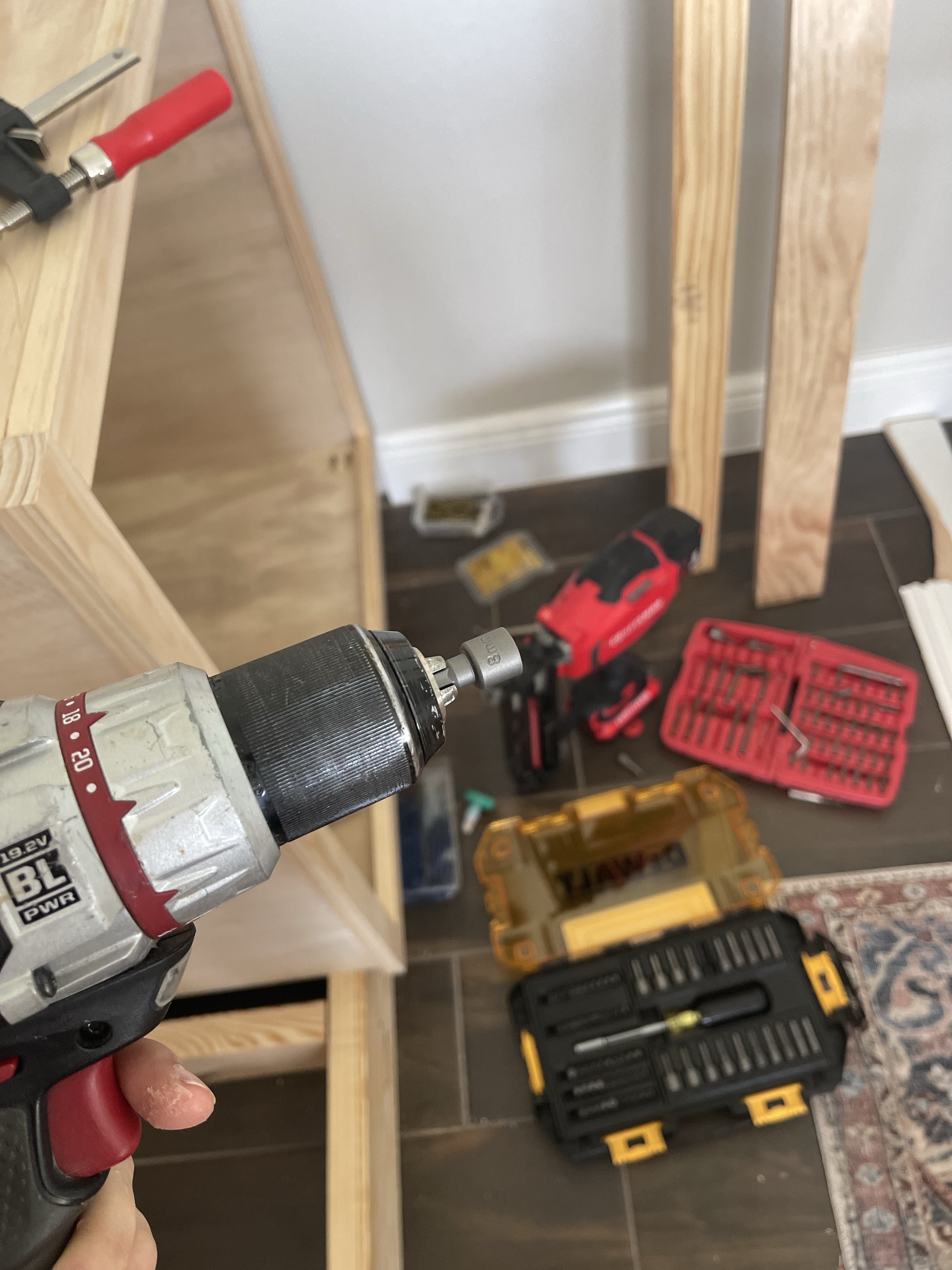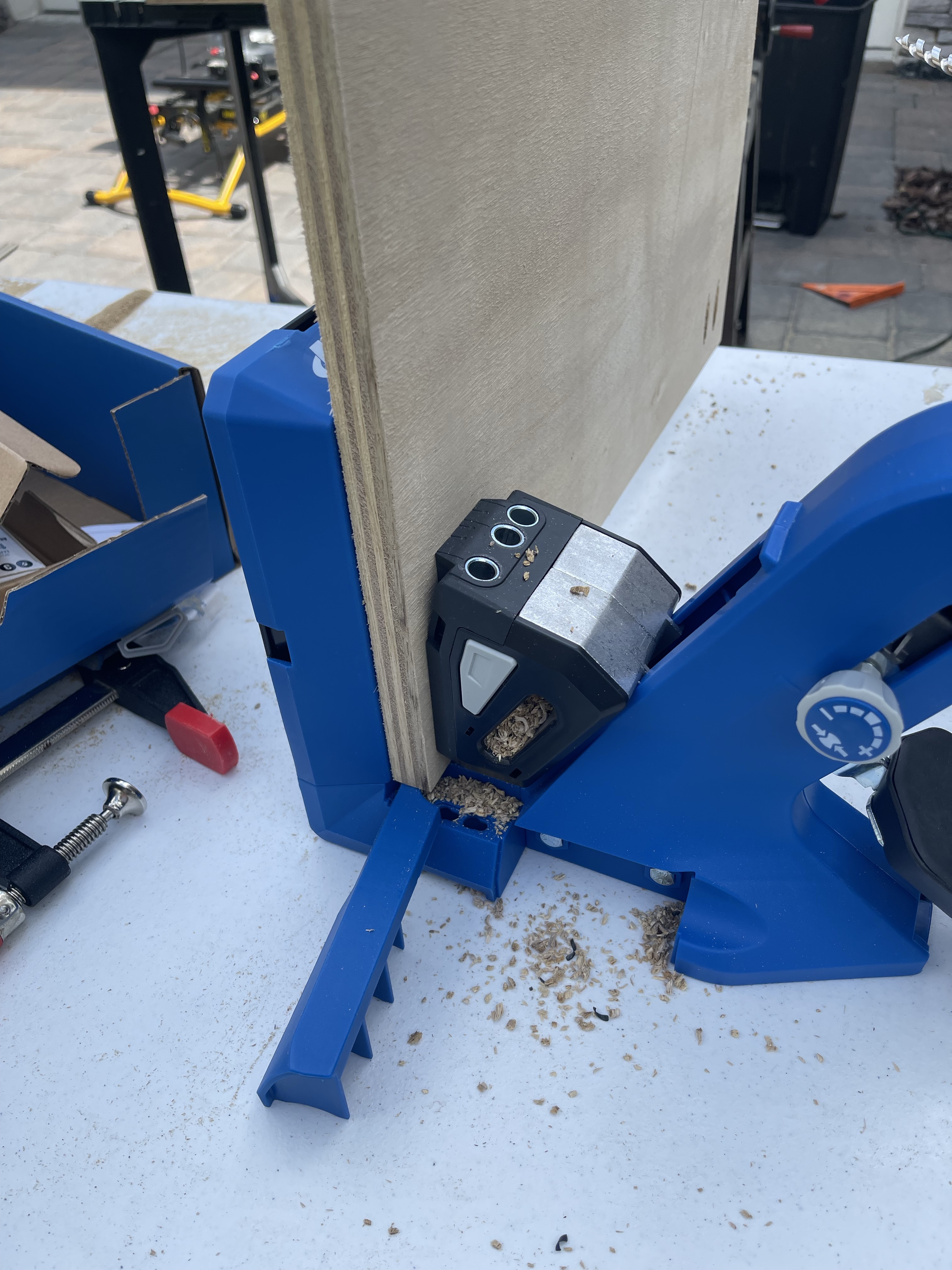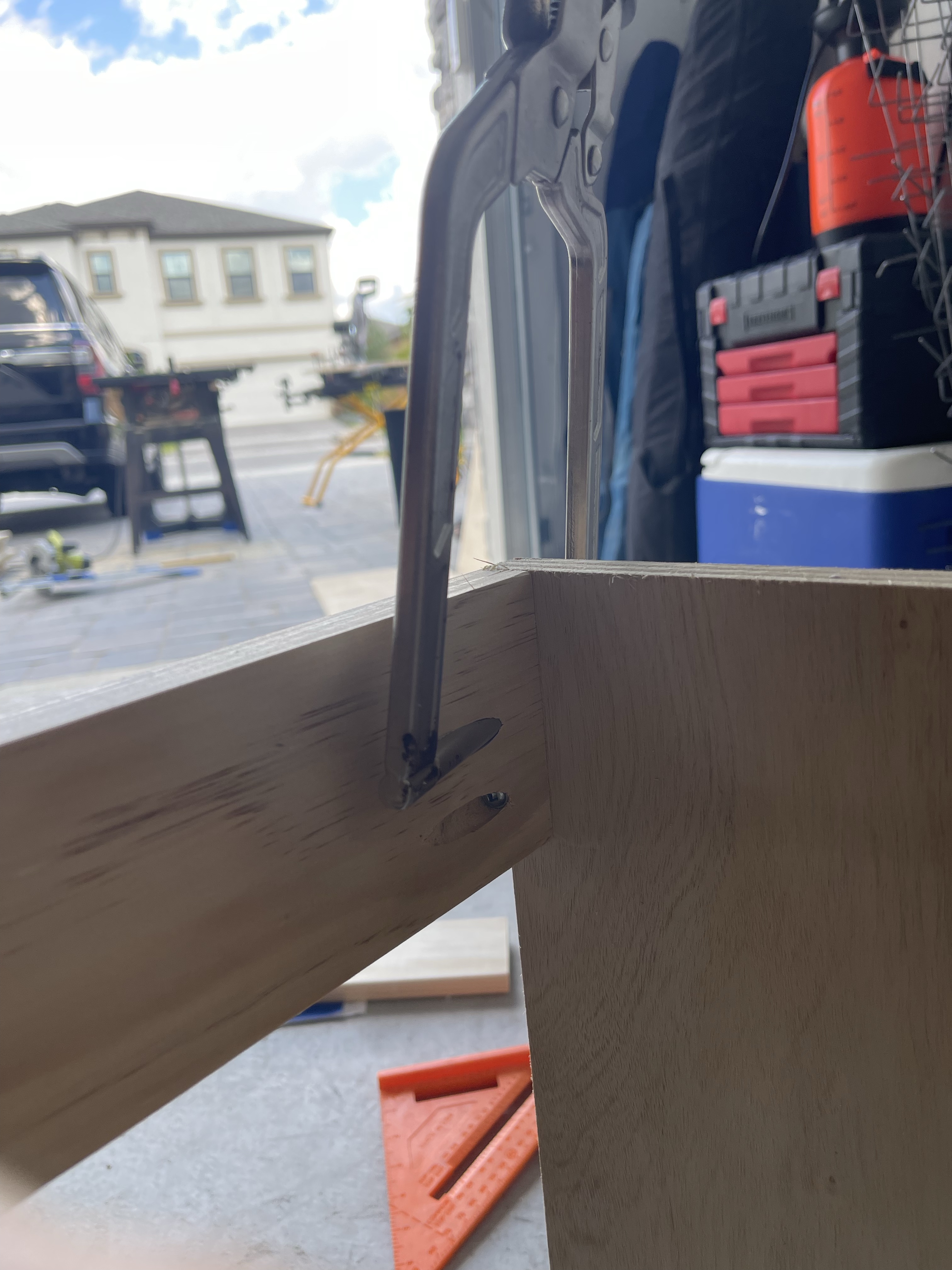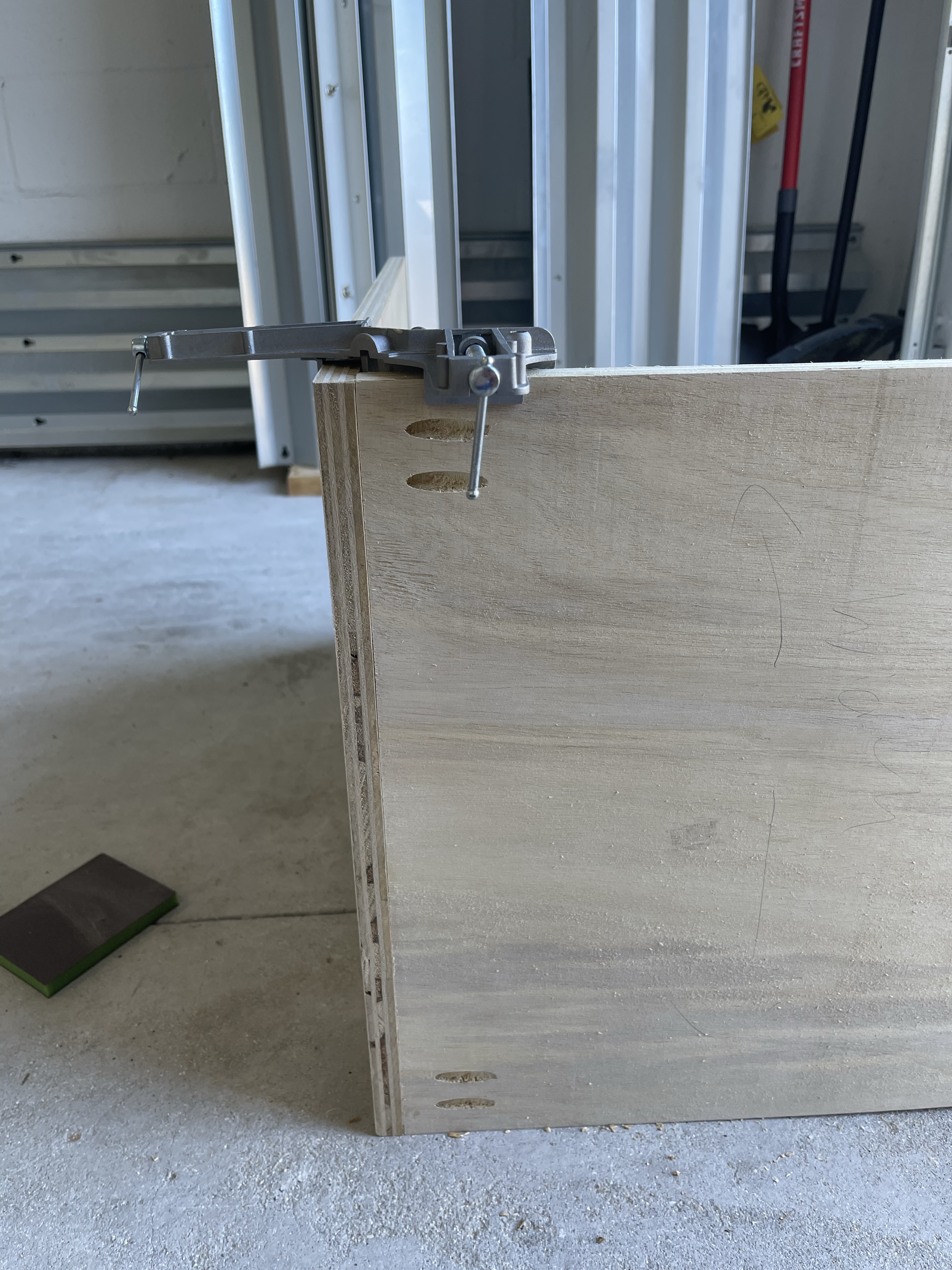 Hands down, my all time favorite pocket hole jig has been the Kreg 720 Pocket Hole Jig. Its worth the few extra bucks for its ease of use alone, add into that the dust collection and its just perfection (this is not sponsored though I wish it was! Kreg products are a dream to work with). I drill a total of 8 at the bottom of each cabinet base, 2 at each corner. I’ll attach them to the sides of the cabinet with wood glue and 1 1/4″ pocket hole screws. I utilize corner clamps as a second pare of hands as I do this and I always check my corners with a speed square. If your cabinets are not square, you’re just creating a series of issues down the line, trust me, I speak from experience. Talk about a headache.