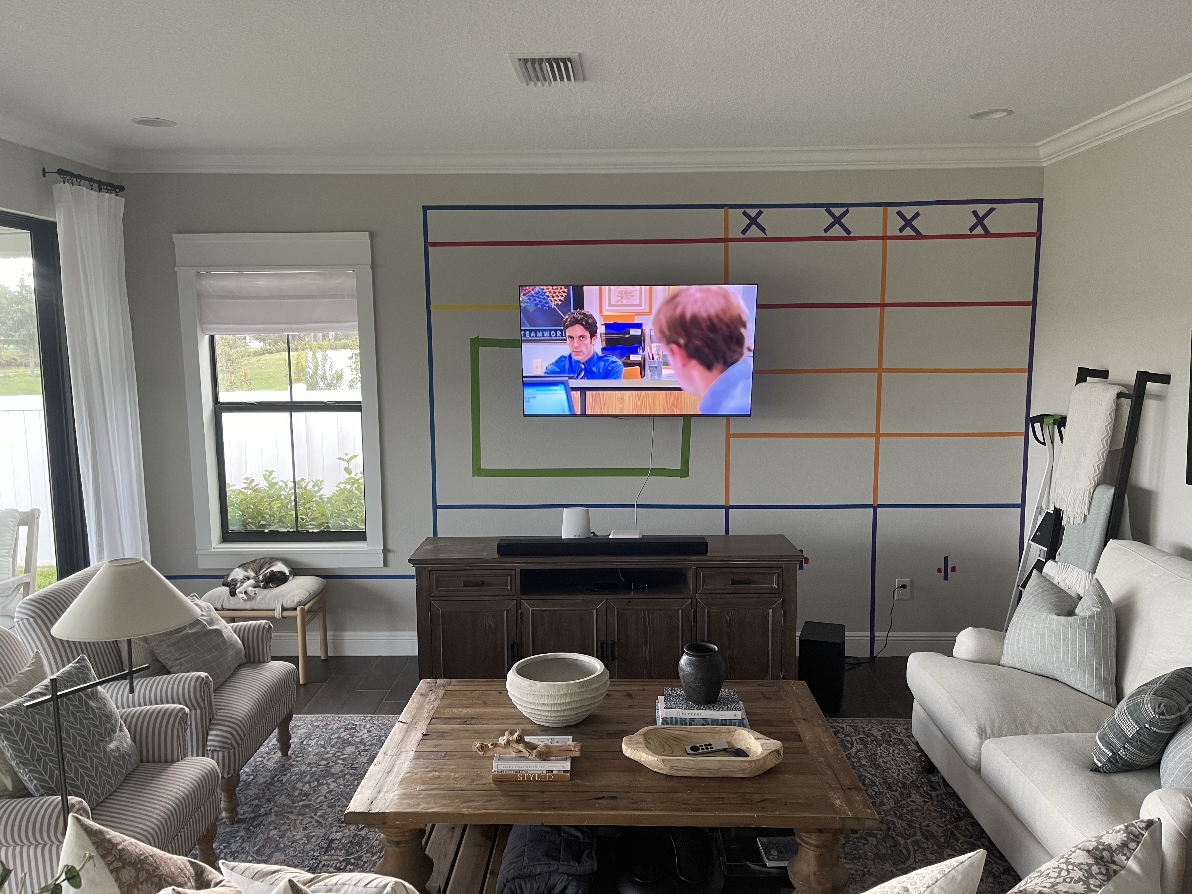 As I mentioned in my previous post, the major part of this living room refresh will be the addition of a large built in entertainment unit with cabinets, shelves and a window bench. Now when I start a built in unit, I like to tape off my space so I can visualize my plans and make sure that it works in the space. You’ll see how I do that below. Don’t pay any attention to the different colors of tape, I just work with whatever I have on hand, and it was a rainbow of colors this time around.