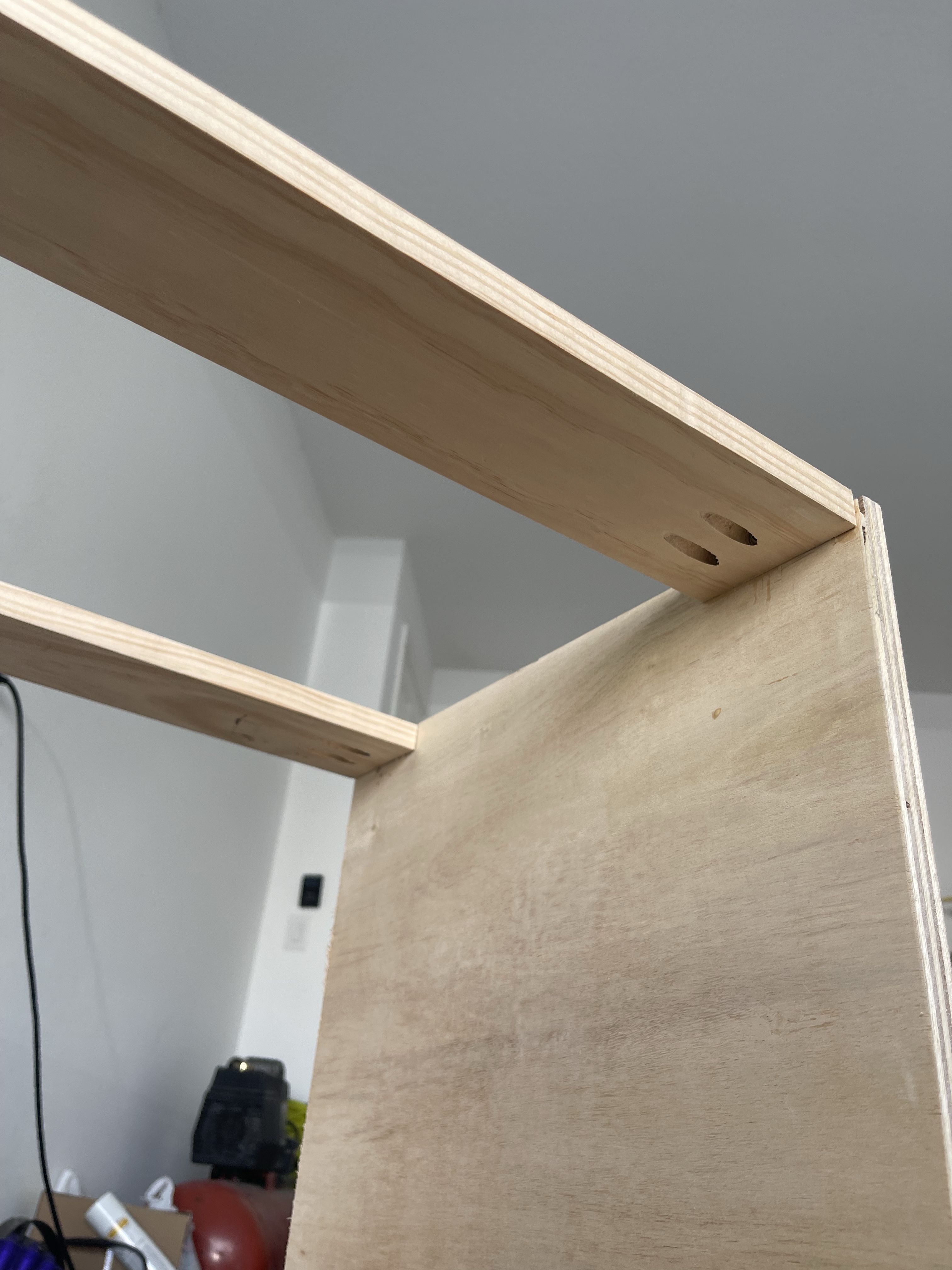 You’ll notice I don’t have a back piece for my cabinet. This is entirely preference for me. You can add a back with more 3/4″ plywood, you can even use a 1/4″ and just nail it to the back . . . and in my office cabinet build I used 1×3 support beams . . . but for the sake of budget, I made the choice not to add one. My cabinets are being installed against the wall, and I will just be painting them to match. So let’s move on to the top support beams of the cabinet.