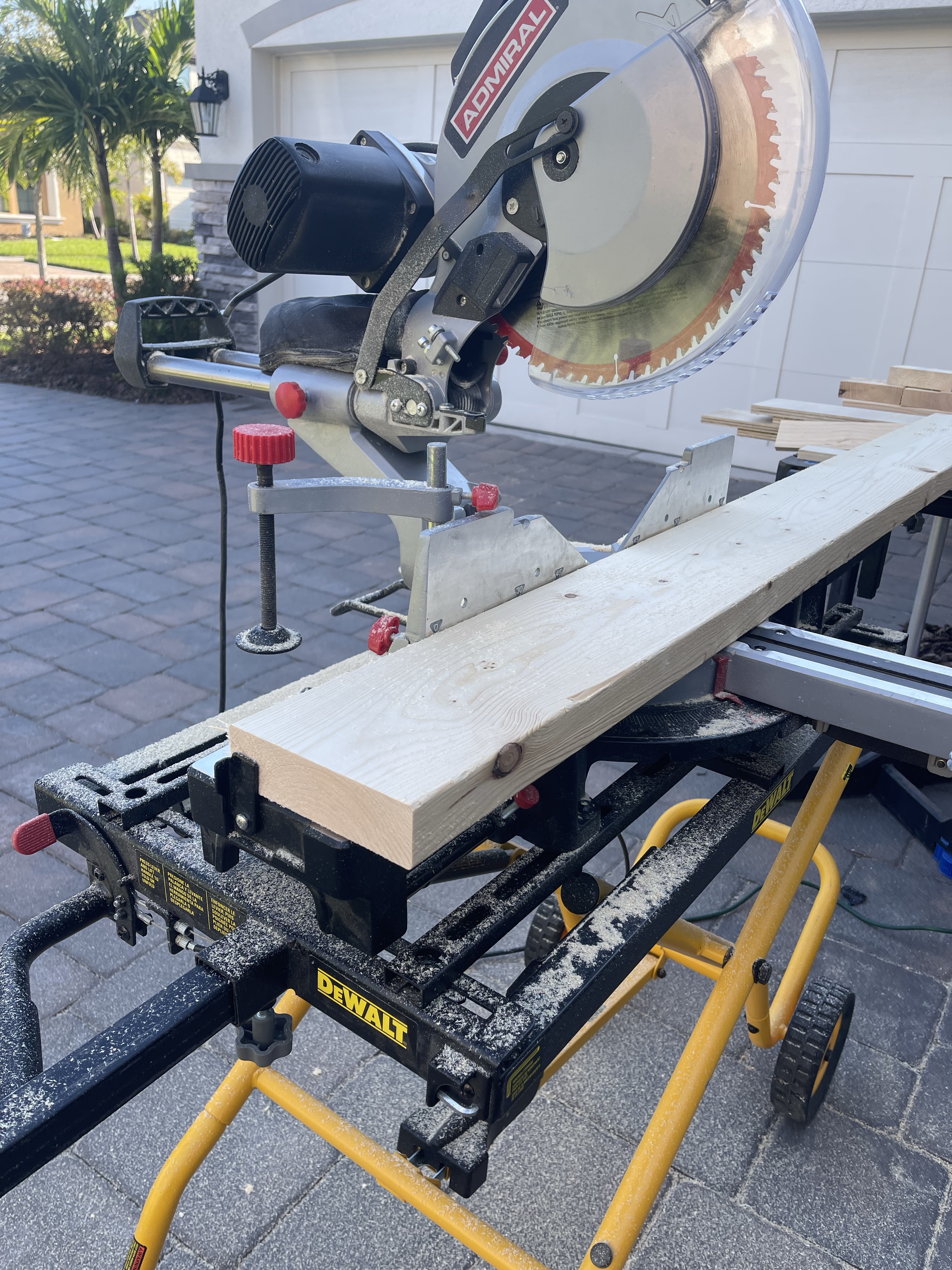 Next step would be to build the bases. I like to build “ladder” bases, and usually I do this with a 2×4, but I wanted more height to my cabinets, so I opted to work with 2×6 lumber. Ultimately I wanted to build a total of 4 lower cabinets, and I wanted 2 cabinets to sit on each base, So I purchased several 8′ long 2×6 boards and cut them down on my mitre saw to the width of each cabinet base. I then cut the joists as well (these are the pieces that run the depth of your unit) . . . and I cut enough that I could place one every 16-20 inches of the base. Hot tip : I set the stopper on my mitre saw to help me cut all the pieces exactly the same as seen in the image below. Also, determining the depth of the ladder is entirely up to you. I did not want a toe kick, so I built the final depth to match my cabinets (minus the face frame) exactly. More on that in a future post when I add the baseboards.