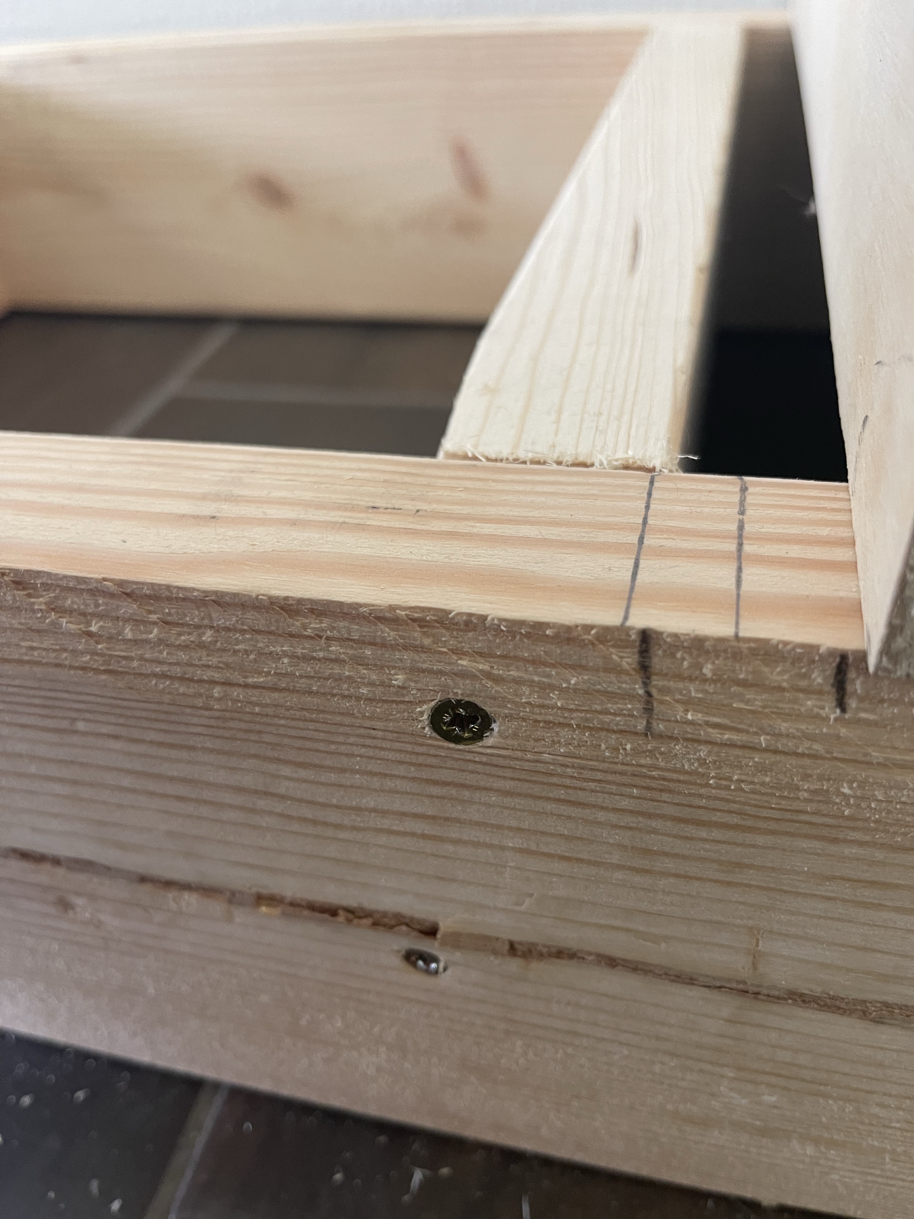 These bases were not very deep, so I had to get creative when I assemble them. If the spacing allows, I like to attach joists to the front and back piece with pocket holes, but with this particular ladder base, my drill would not fit to do that with both sides. The way I worked around that was to attach the joists to the back 2×6 using 2 1/2″ pocket hole screws, and then the front with 3″ wood screws. Wood glue is a must for this as well. And to help ensure everything is being built perfectly, I love to use corner clamps to hold my joints as I screw them together, speed squares to check for 90 degree corners and a level to ensure everything is straight.
